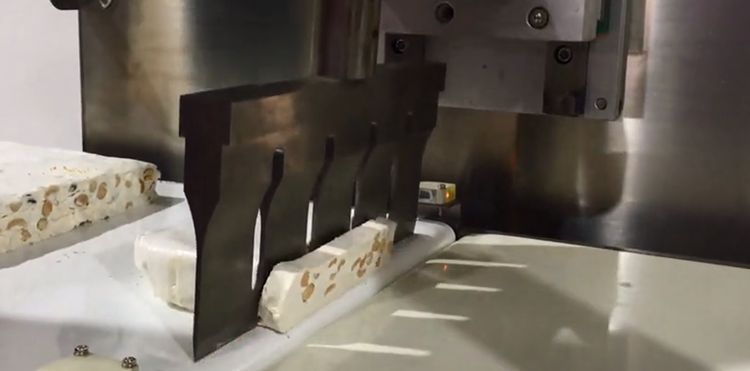 驰飞超声波响应国家号召在食品自动化切割装置上贡献巨大作用,研发自动化超声波牛轧糖切片机,这一机器具有自动对齐、自动传输、自动定位、自动切割等作用。要想牛轧糖物料符合人们所需要的尺寸和形状,就使用食品自动切割装置对牛轧糖整块物料进行机械剪裁和剪切。超声波食品自动切割装置通过红外线定位进行稳定的定量和匀速进给,从而获得统一预定厚度的牛轧糖。而当整块牛轧糖物料传输至红外线定位点时,超声波切割刀会自动进行切割。无论是何种食品物料切割都会产生不同程度的废料,超声波食品自动切割装置可完成除废料作业,机械自动分离成品与废料,减少人力参与,保证食品无菌化生产。