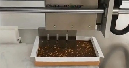 蛋糕超声波切片机可用于在托盘中切割产品。超声波切割机使用定制化钛合金刀片,可完全适合于任意托盘中切割。全自动系列的超声波切割设备拥有自动定位系统,确保均匀的切割,不会破坏容器。被切割后产品可以被包装和运输,切片出售。