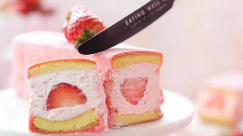 除了大红色外,新年也很适合这种温柔的粉色,这款草莓白玉卷外头是糯叽叽的表皮,内里满满的奶油鲜果,因为蛋糕的加入整体又不腻~